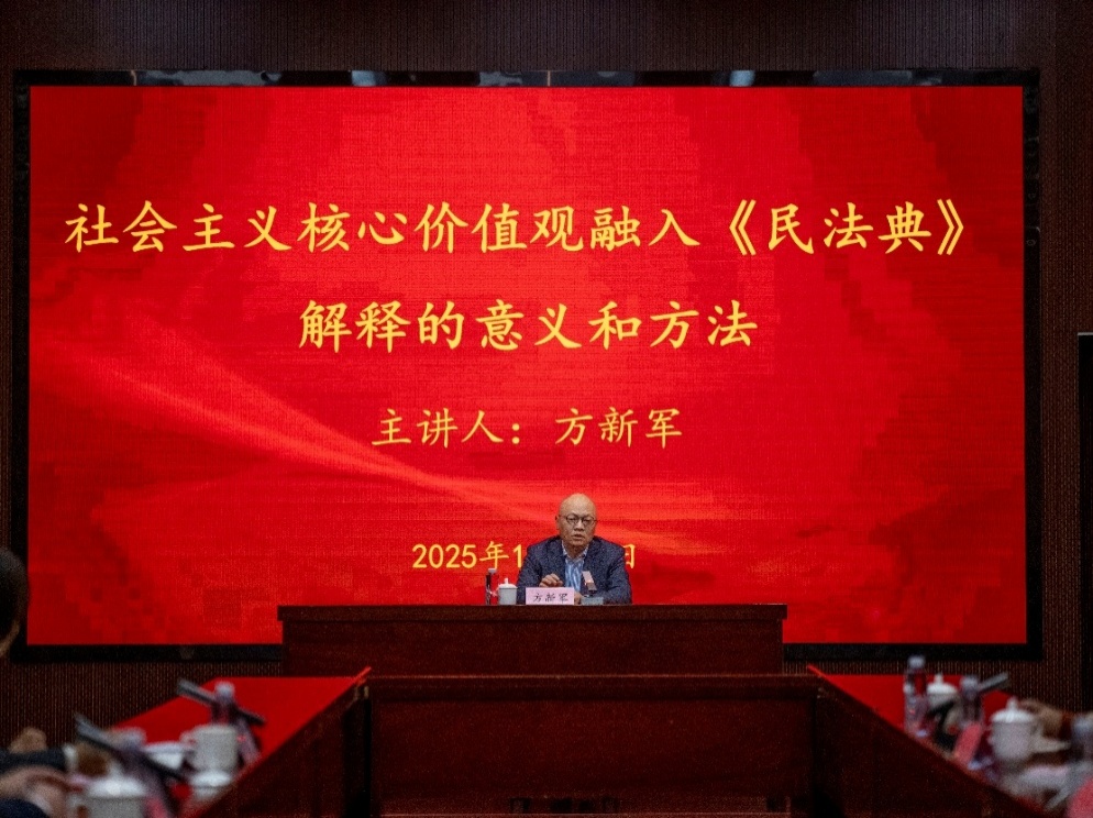 方新军书记以“社会主义核心价值观融入《民法典》解释的意义和方法”为题,讲授了一堂生动的微党课。通过“脑死亡与临床死亡”工伤认定案、“开发商自我举报毁约案”等实例,他深入浅出地阐释了如何以核心价值观强化裁判说理,提升司法公信力。党课引发了热烈讨论,法院干警就实务中遇到的疑难问题与学院专家互动,形成了理论与实践的思维碰撞。