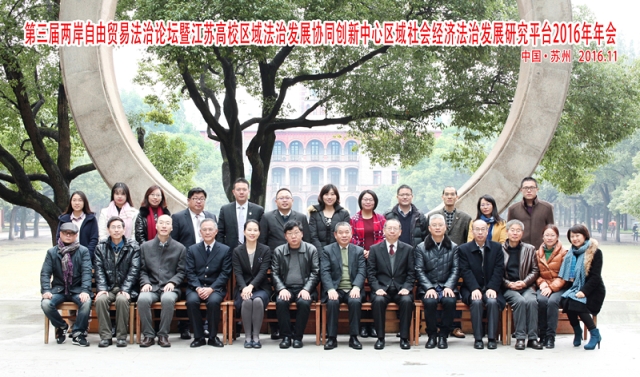 11月26日至11月27日,第三届两岸自由贸易法治论坛暨江苏高校区域法治发展协同创新中心区域社会经济法治发展研究平台2016年年会在我院举行。本次会议分为四个单元,共有来自台湾东吴大学、上海财经大学、上海对外经贸大学、上海外国语大学、东南大学、南京师范大学、南京财经大学、江苏省社科院、扬州大学、四川大学、四川理工学院、中国国际贸易促进委员会苏州市委员会、苏州大学等学术单位的40余名专家学者参会。