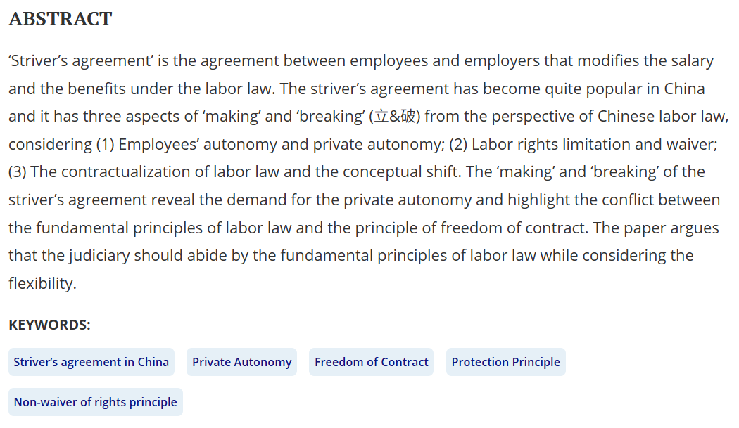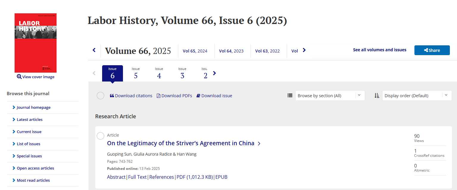 权威刊物《劳工史》(Labor History)2025年第6期刊发了我院孙国平教授的论文“On the Legitimacy of the Striver’s Agreement in China”。现将文章内容摘要分享如下: