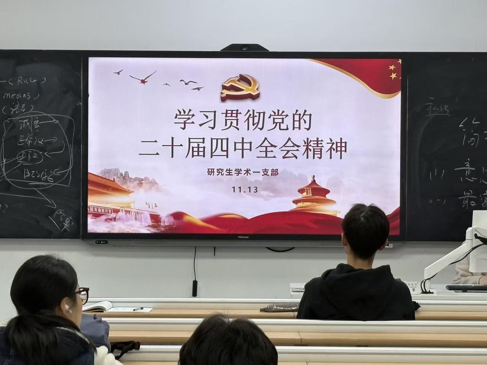 为深入学习领会党的二十届四中全会精神,切实把支部成员的思想和行动统一到党中央决策部署上来,我院学术型研究生一支部于11月13日组织开展了以“学习贯彻党的二十届四中全会精神主题学习活动”专题学习会。活动通过观看理论讲座视频、分享学习体会等形式,推动全会精神入脑入心、落地生根。