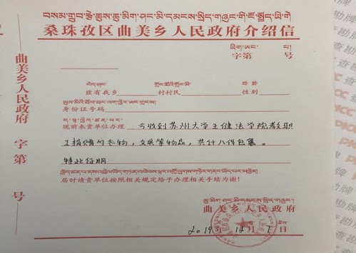 王健法学院分工会向西藏日喀则市桑珠孜区曲美乡捐赠衣物、文具