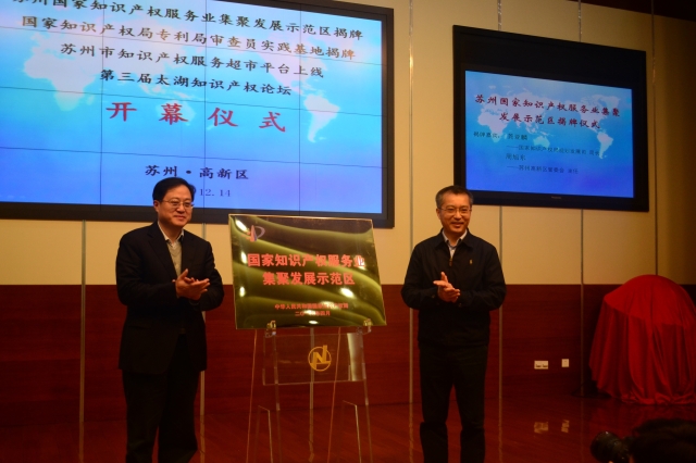 2016年12月14日上午,第三届太湖知识产权论坛开幕式,暨苏州国家知识产权服务业集聚发展示范区揭牌、国家知识产权局专利局审查实践苏州高新区基地授牌、苏州市知识产权服务超市平台上线仪式在苏州高新区管委会隆重举行。本届论坛以知识产权强国建设——创新、转型与知识产权服务贸易为主题,由苏州大学、苏州市知识产权局、苏州高新区管委会共同主办,苏州大学苏州知识产权研究院、苏州大学王健法学院、国家知识产权局专利局苏州专利代办处、苏州慧谷知识产权服务有限公司、苏州创元专利商标事务所有限公司共同承办。本届论坛受到了学术界与实务界的广泛关注,共有200多名来自省内外知名知识产权研究机构、服务机构和大型企业的学术及实务专家参加论坛。