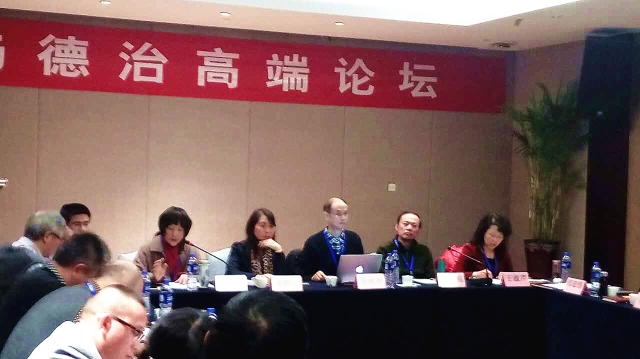 我院2016级法理学博士生刘辉作为唯一的学生身份发言者,在论坛第四阶段做了主题发言,介绍了对于法治与道德自省关系的认识,指出社会自治与道德建设具有正相关的联系,并针对第二、三阶段中单纯寄望于掌权者自律、过度淡化法治作用的发言进行了提问和探讨。