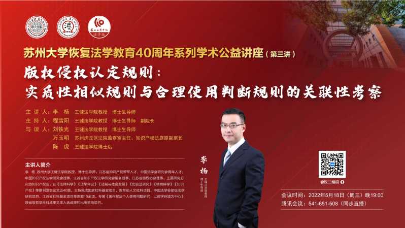 苏州大学恢复法学教育40周年系列学术公益讲座(第三讲) 版权侵权认定规购: 实质性相似规购与合理使用判断规则的关联性考察