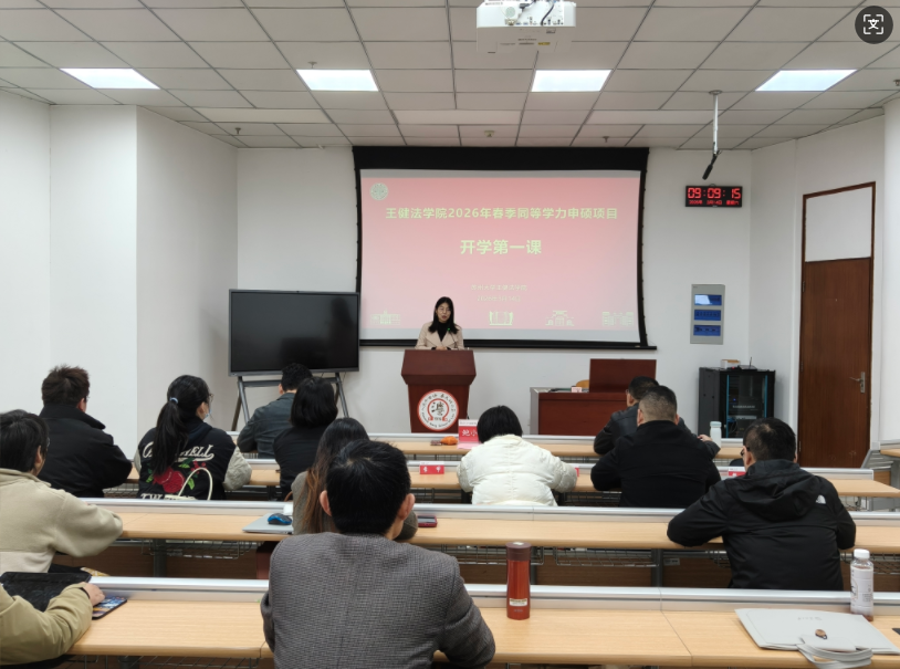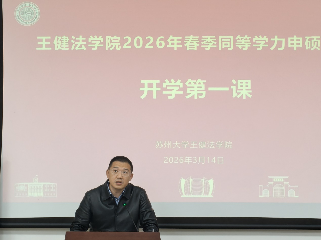 春风送暖,万象更新。3月14日上午,苏州大学王健法学院2026年春季同等学力申硕项目“开学第一课”在学院A108教室顺利举行。本次活动由学院对外合作办姜培丽主持,王健法学院副院长鲍小娟,学员代表、上海段和段(南通)律师事务所创始合伙人、执委会副主任周永旺,以及继续教育学院同等学力申硕项目老师陆君超出席活动,与新老同学共同探讨新学期学习规划。