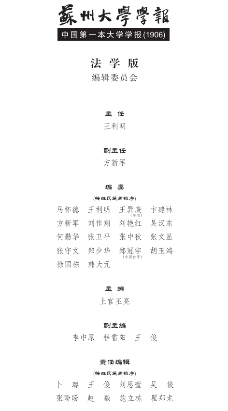 《苏州大学学报(法学版)》(Journal of Soochow University Law Edition)是一本国家新闻出版总署批准、江苏省教育厅主管、苏州大学主办、苏州大学王健法学院具体承办,2014年创刊、国内外公开发行的专业性法学类学术期刊,是法学院对外交流的重要平台。