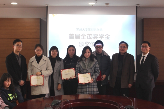 2017年3月8日下午,首届金茂奖学金颁奖仪式在我院二楼会议室如期举行。参加此次颁奖礼的嘉宾有:上海市金茂(昆山)律师事务所主任金文玮先生、律师顾春秀女士、律师周彬先生、我院党委书记周国华、学工办主任钱春芸以及团委指导老师曹妍。钱春芸老师担任本次颁奖仪式的主持。