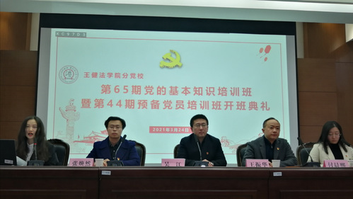 3月24日下午,王健法学院分党校第65期党的基本知识培训班暨第44期预备党员培训班开班典礼在中式模拟法庭顺利举行。学院党委书记、分党校校长吴江老师,学院党委副书记兼副院长、分党校副校长王振华老师,学院学生工作办公室副主任张焕然老师,研究生辅导员付晨熙老师出席,学院学生党务中心李兰心同学主持,全体学员参加了开班典礼。
