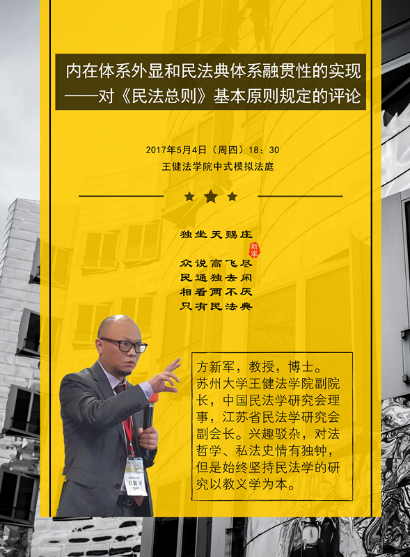 简 介:方新军,教授,博士。苏州大学王健法学院副院长,中国民法学研究会理事,江苏省民法学研究会副会长。兴趣驳杂,对法哲学、私法史情有独钟,但是始终坚持民法学的研究以教义学为本。