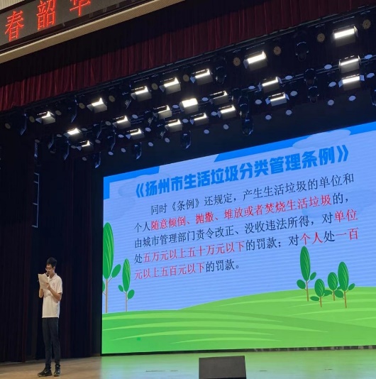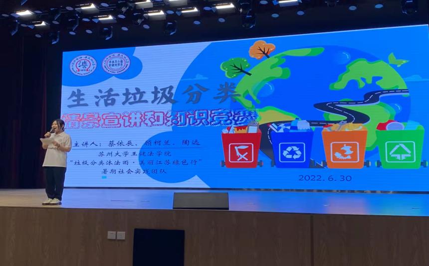 2022年4月29日扬州市第九届人民代表大会常务委员会第二次会议通过、2022年5月31日江苏省第十三届人民代表大会常务委员会第三十次会议批准的《扬州市生活垃圾分类管理条例》将于2022年9月1日起施行。在垃圾分类管理条例实施的前夕,王健法学院社会实践团队成员抢先为苏州大学高邮实验学校的同学们进行讲解,从垃圾分类意义、垃圾分类方法、垃圾分类法制三个角度出发,讲解了垃圾分类的四大标准与处理垃圾的注意点,让同学们对垃圾分类法制建设有了新的认识,同时社会实践团队成员以有奖知识竞赛的方式,加深同学们对垃圾分类的生活常识和法律知识的理解,为《扬州市生活垃圾分类管理条例》的实施做好铺垫准备,共建美丽校园。