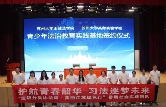 值此苏州大学恢复法学教育四十周年之际,为进一步推进王健法学院“铸魂逐梦”工程的实施,着力抓好实践育人环节,培养新时代德法兼修的高素质法治人才,2022年6月29日至7月1日,苏州大学王健法学院组织大学生社会实践团队来到苏州大学高邮实验学校开展暑期社会实践活动,共建青少年法治宣传教育基地。