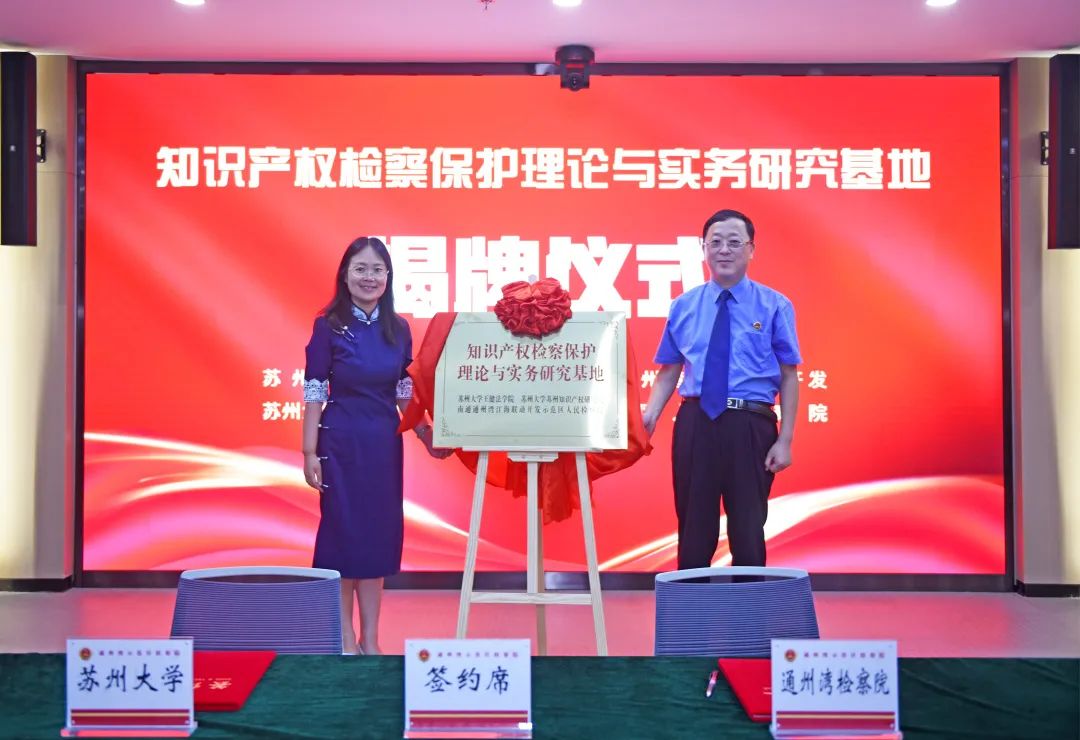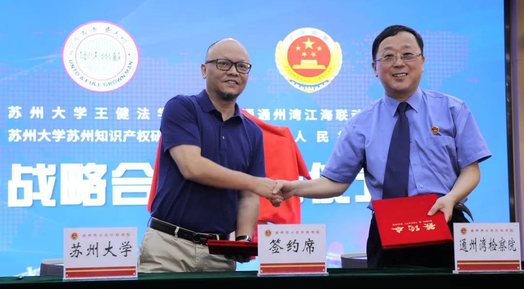 7月6日上午,王健法学院、苏州大学知识产权研究院与南通市通州湾示范区检察院签署战略合作协议,共建“知识产权检察保护理论与实务研究基地”。南通市人民检察院党组书记、检察长恽爱民,通州湾示范区党工委副书记、管委会主任施宏杰,通州湾示范区检察院党组书记、检察长曹卫星,王健法学院院长方新军、党委书记孙宁华、党委副书记兼副院长朱春霞、院长助理赵毅等出席活动。