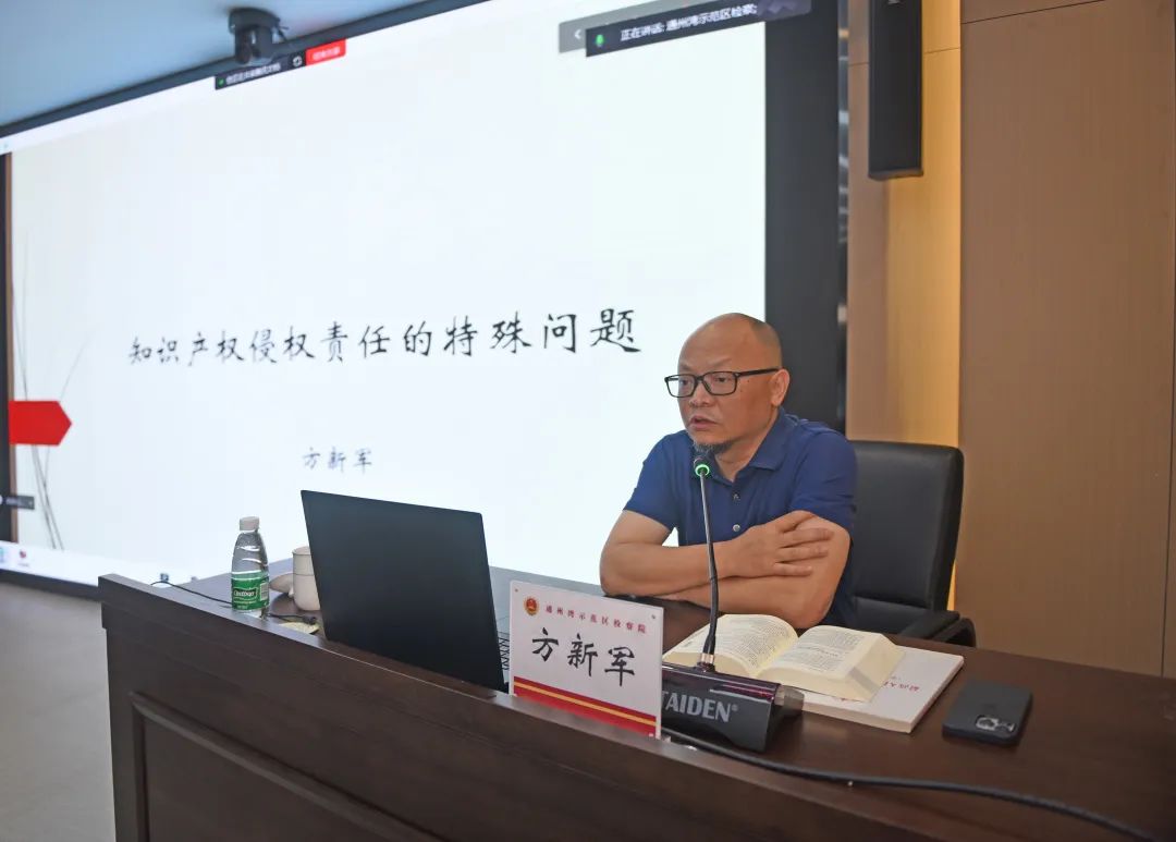 仪式结束后,方新军院长围绕知识产权中的特殊法律问题作首场讲座。来自南通地区法院、检察院、公安局、市场监督管理局、知识产权保护中心等部门的业务骨干和律师代表现场听讲。讲座还通过腾讯会议APP全程直播,南通市检察机关人才库成员等同步线上观看。