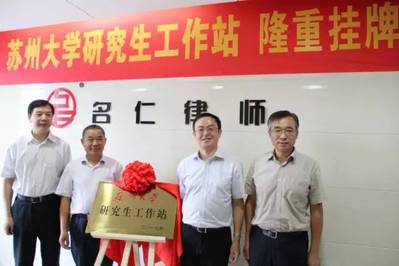 “研究生工作站”是苏州大学培养硕博研究生的创新实践。2017年8月10日下午,“苏州大学研究生工作站”挂牌仪式在江苏名仁律师事务所隆重举行,该研究生工作站将与我院合作培养法学专业研究生。参加此次仪式的嘉宾分别为:苏州大学党委研究生工作部长宁正法、我院院长胡玉鸿、副院长方新军、办公室主任肖丽娟、研究生秘书胡育新;姑苏区委常委、政法委书记徐文祥、姑苏区司法局局长黄慧、副局长顾东怀、律公处处长邵晓敏、副处长兼姑苏区律师协会秘书长何方敏;以及江苏名仁律师事务所高级合伙人朱建军、杨金元、陈晔、虞浩础和部分律师代表。