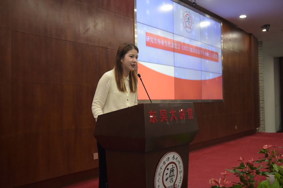 研究生毕业生代表2021级诉讼法学专业王靖萱以“寻找答案”为题进行发言。入学时,她不知道求学的答案是什么,于是为自己列了“来到苏州读书必做的100件小事”,虽然目前只完成了87件,但在穿上硕士服学位服的瞬间,她找到了答案。有的人升学读博,有的人开拓创业,有的人步入社会。所谓答案,并非是统一固定的,而是永远乐观向上,开拓进取的人生态度,她祝愿每一位毕业生未来都能拥抱野蛮生长后更加优秀的自己。