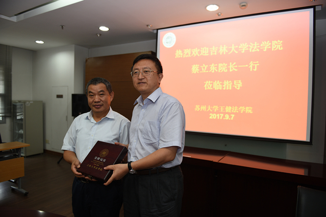 2017年9月7日上午,吉林大学法学院院长蔡立东、党委书记周春国、副院长徐岱、副院长曹险峰、办公室主任于冰等一行五人莅临我院调研工作。我院院长胡玉鸿、党委书记周国华、副院长方新军、副院长严俊、党委副书记兼副院长王振华、院长助理程雪阳、院长助理卜璐、图书馆副馆长杨军以及办公室主任肖丽娟在我院大会议室对蔡院长一行进行了热情接待。