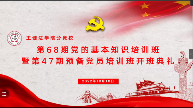 2022年10月18日晚,王健法学院分党校第68期党的基本知识培训班暨第47期预备党员培训班开班典礼在腾讯会议平台顺利举行。党委宣传部部长吴江,王健法学院党委书记、分党校校长孙宁华,学院党委副书记、分党校副校长朱春霞,研究生辅导员付晨熙,研究生辅导员田毓出席。开班典礼由法学院分党校实践调研部林赛柔同学主持,全体学员参加开班典礼。