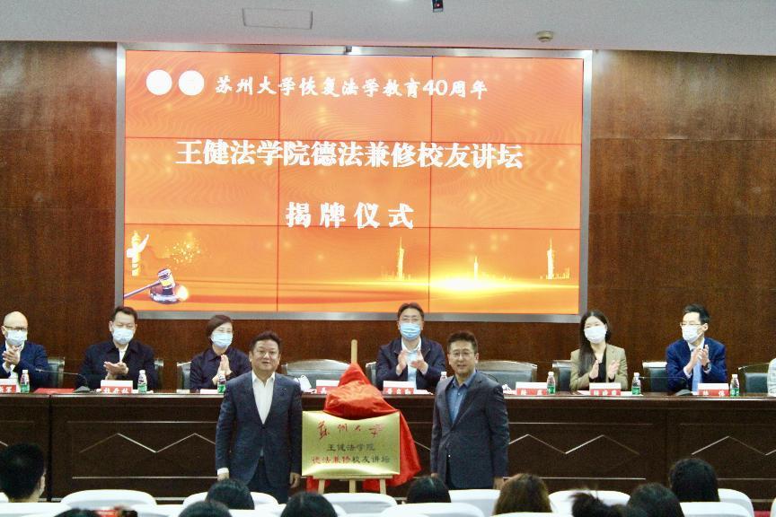 随后,苏州大学党委常委、党委宣传部部长吴江、苏州大学国内合作发展处处长陆岸共同为德法兼修校友讲坛揭牌。