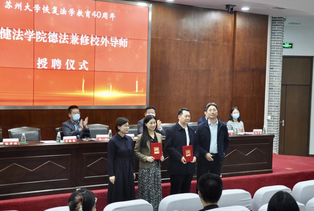 苏州大学党委研究生工作部部长茅海燕、苏州大学党委学生工作部部长董召勤为两位优秀校友颁授德法兼修校外导师聘书