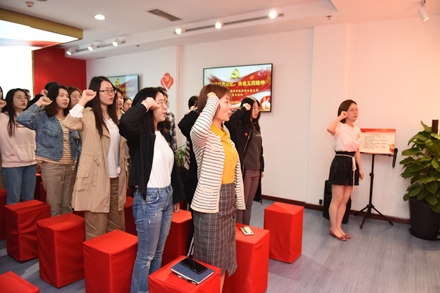 最后,全体党员在曹妍老师的带领下面向党旗,重温入党誓词。在鲜红的党旗下,全体党员眼神坚定而铿锵有力的庄严宣誓。