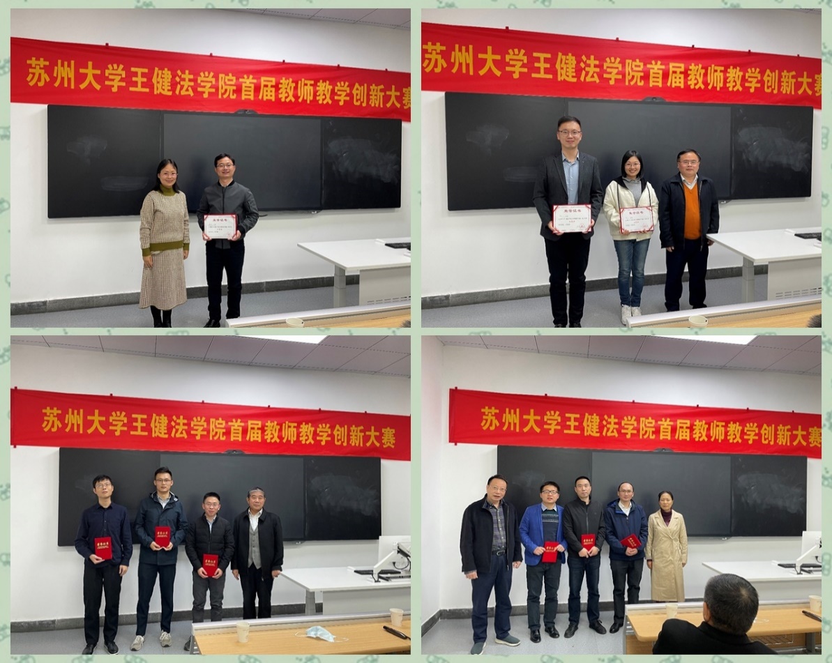 经过激烈的角逐,宪法学与行政法学教研室唐冬平老师荣获一等奖,经济法学教研室方翔老师与环境法学教研室李雪老师获得二等奖,诉讼法学教研室邵聪老师、知识产权教研室陈虎老师与法理学教研室尹德贵老师分获三等奖,其余参赛教师获得优秀奖。唐冬平老师将代表学院参加苏州大学第二届教学创新大赛。