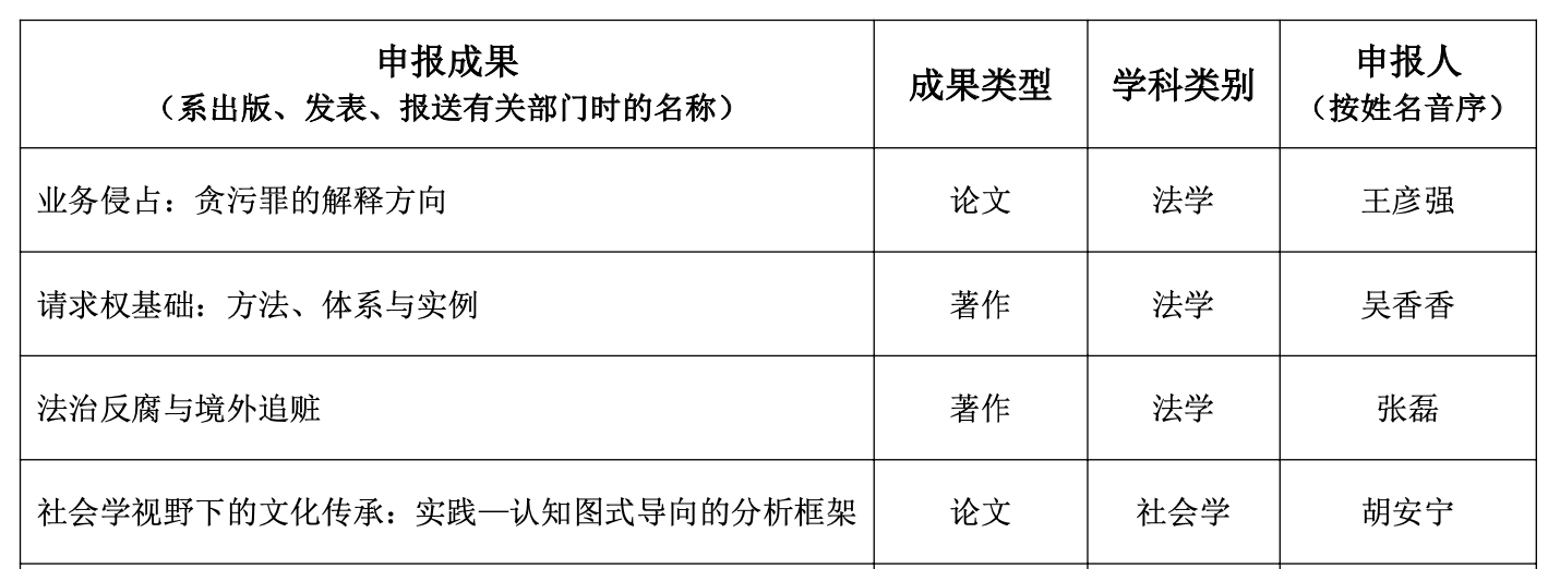 本届评奖,经专家评审、面向社会公示、奖励委员会审议通过和教育部批准,共有1496项成果获奖(含香港、澳门高校获奖成果)。其中,法学类研究成果获得一等奖8项,二等奖30项,三等奖35项,青年成果奖10项。