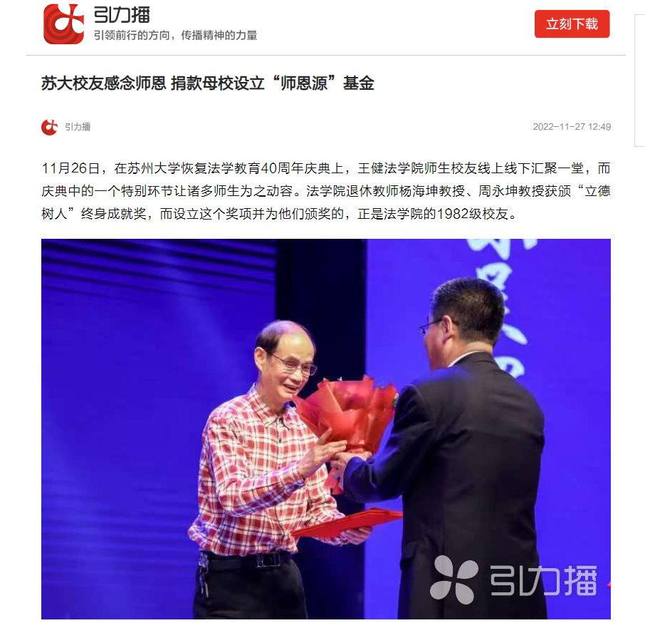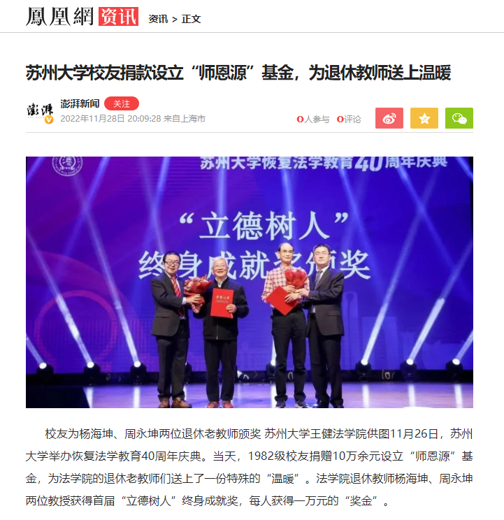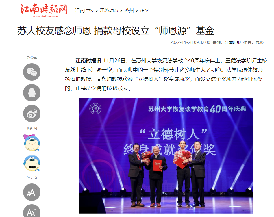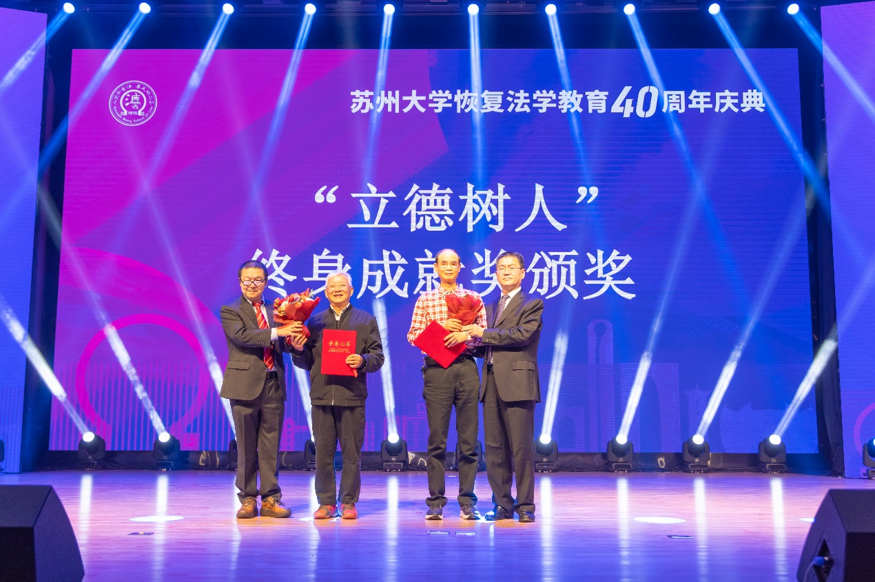 在苏州大学恢复法学教育40周年庆典上,王健法学院师生校友线上线下汇聚一堂,而庆典中的一个特别环节让诸多师生为之动容。法学院退休教师杨海坤教授、周永坤教授获颁“立德树人”终身成就奖,而设立这个奖项并为他们颁奖的,正是法学院的82级校友。