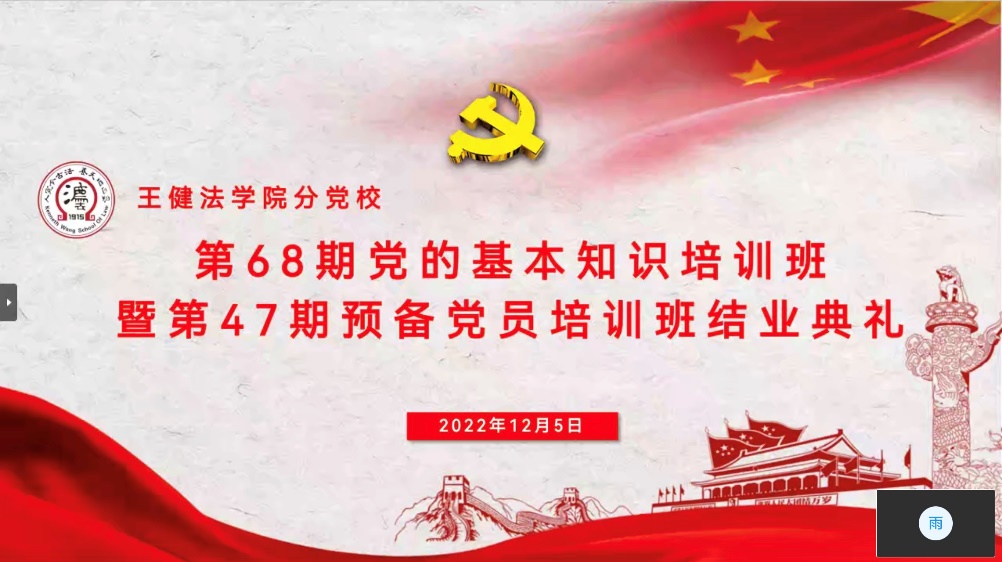 为提升全体学员政治素养,激励广大学员同志踔厉奋发,奋进新时代,12月5日19时王健法学院分党校培训班第二次党课暨结业典礼在线上平台顺利举办。王健法学院党委书记、分党校校长孙宁华,党委副书记、分党校副校长朱春霞,本科生辅导员单杰,本科生辅导员吴凯,本科生辅导员刘桂宏,研究生辅导员张焕然,研究生辅导员付晨熙,研究生辅导员田毓,第68期积极分子、第47期预备党员培训班全体学员参加本次会议,本次会议由分党校实践部谌鑫雨主持。