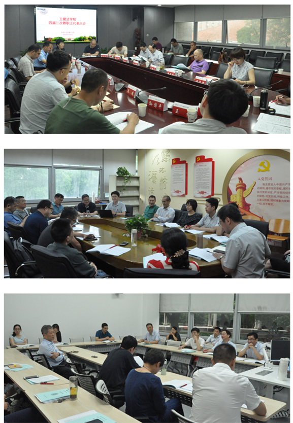 会议中,法学院教职工还听取了沈晔副院长的《王健法学院财务工作报告》及《王健法学院上次教代会提案办理情况报告》,李小伟副教授的《王健财务监督小组工作报告》,张鹏教授的《王健法学院分工会工作报告》。方新军院长、程雪阳副院长、沈晔副院长、朱春霞副书记等还针对此次教代会修订、废止的学院相关文件作了情况说明。孙国平教授、王俊副教授、胡洋主任、吴俊副教授依次围绕加强涉外法律教育、修订博士论文发表计算机制、翻译大赛纳入学生竞赛目录、调整本科培养方案、优化博士后办公环境、增加核心刊物目录、增加培训讲课金等方面提出了议案,并进行了大会说明。
