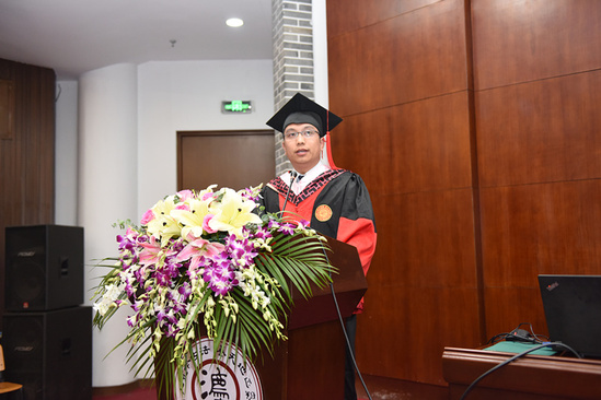2019届博士毕业生代表何登辉上台发言。回顾了自己七年的学习经历,他以“骄傲”和“幸福”为关键词,不忘初心,砥砺前行,并许下郑重承诺:要做一名爱国、有责任心的法律人。
