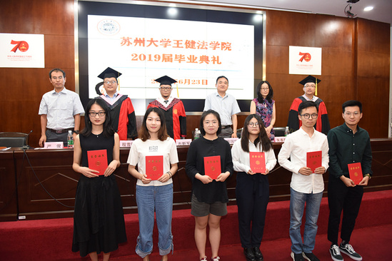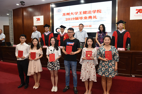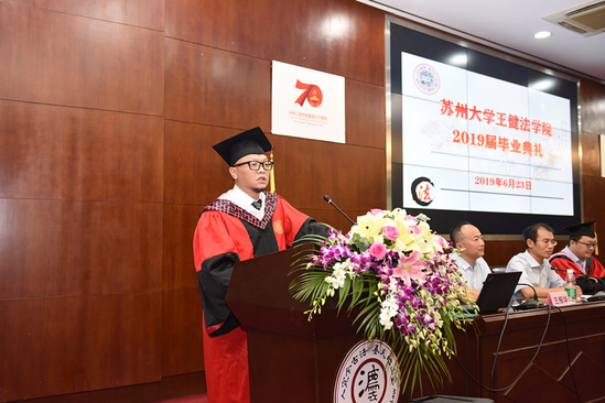 2019年6月23日下午,王健法学院2019届毕业典礼在东吴大讲堂隆重举行。我院院长方新军、党委书记周国华、副院长程雪阳、严俊、朱春霞、院长助理赵毅,及各专业任课教师代表和2019届全体本科毕业生、硕士研究生毕业生、博士研究生毕业生参加了此次典礼。党委副书记兼副院长王振华担任主持。